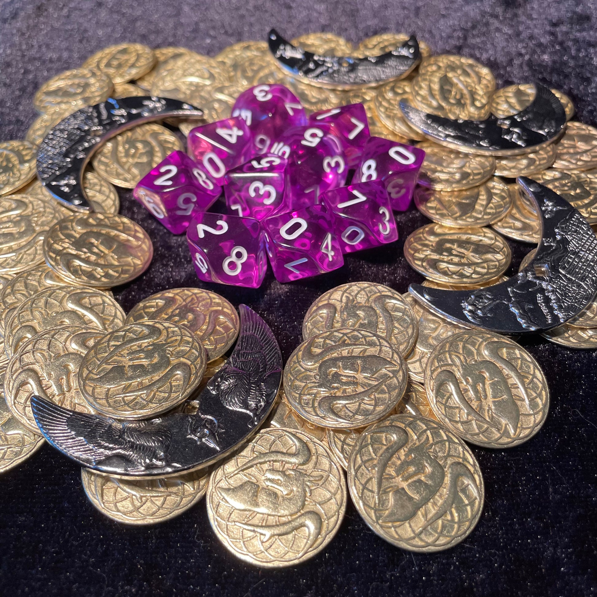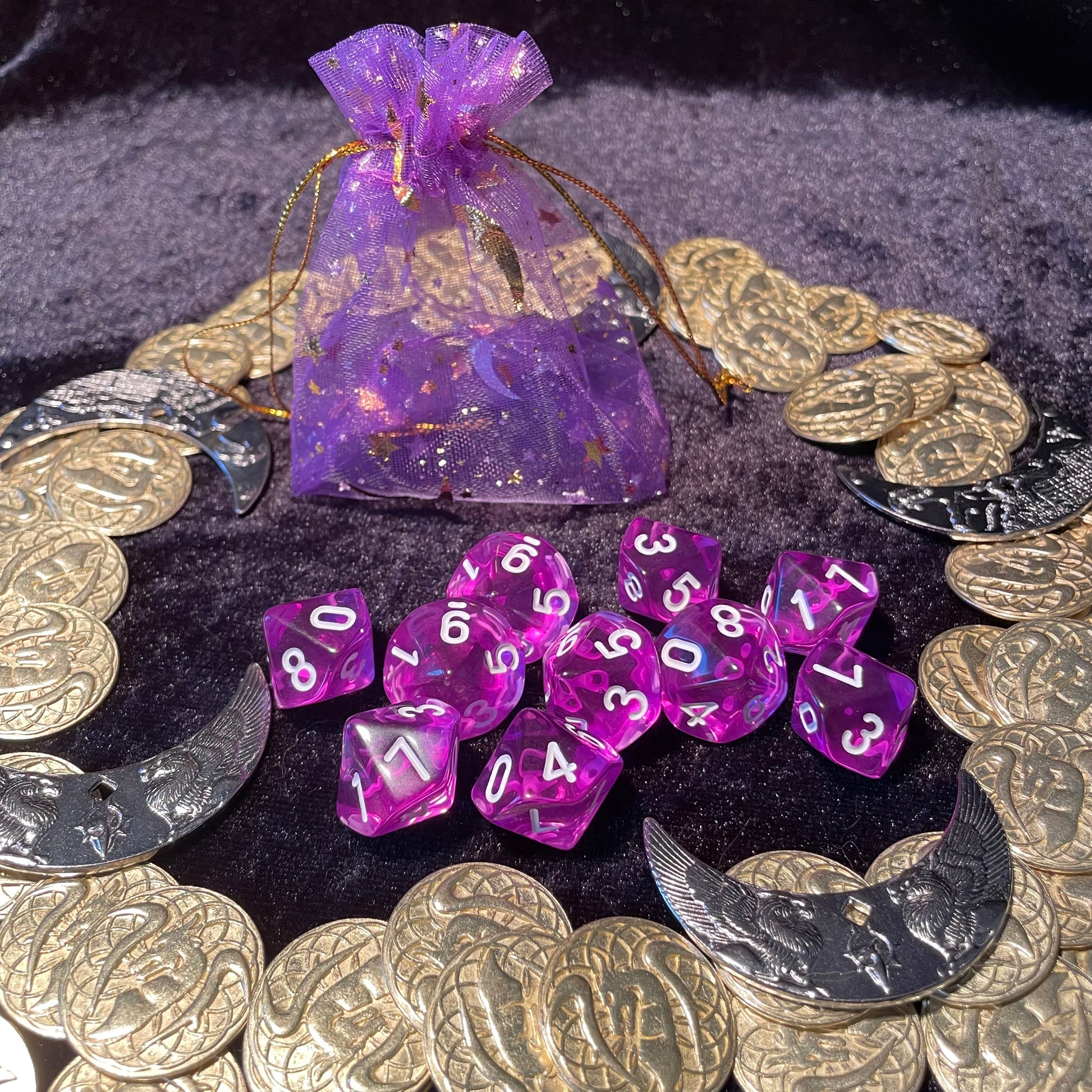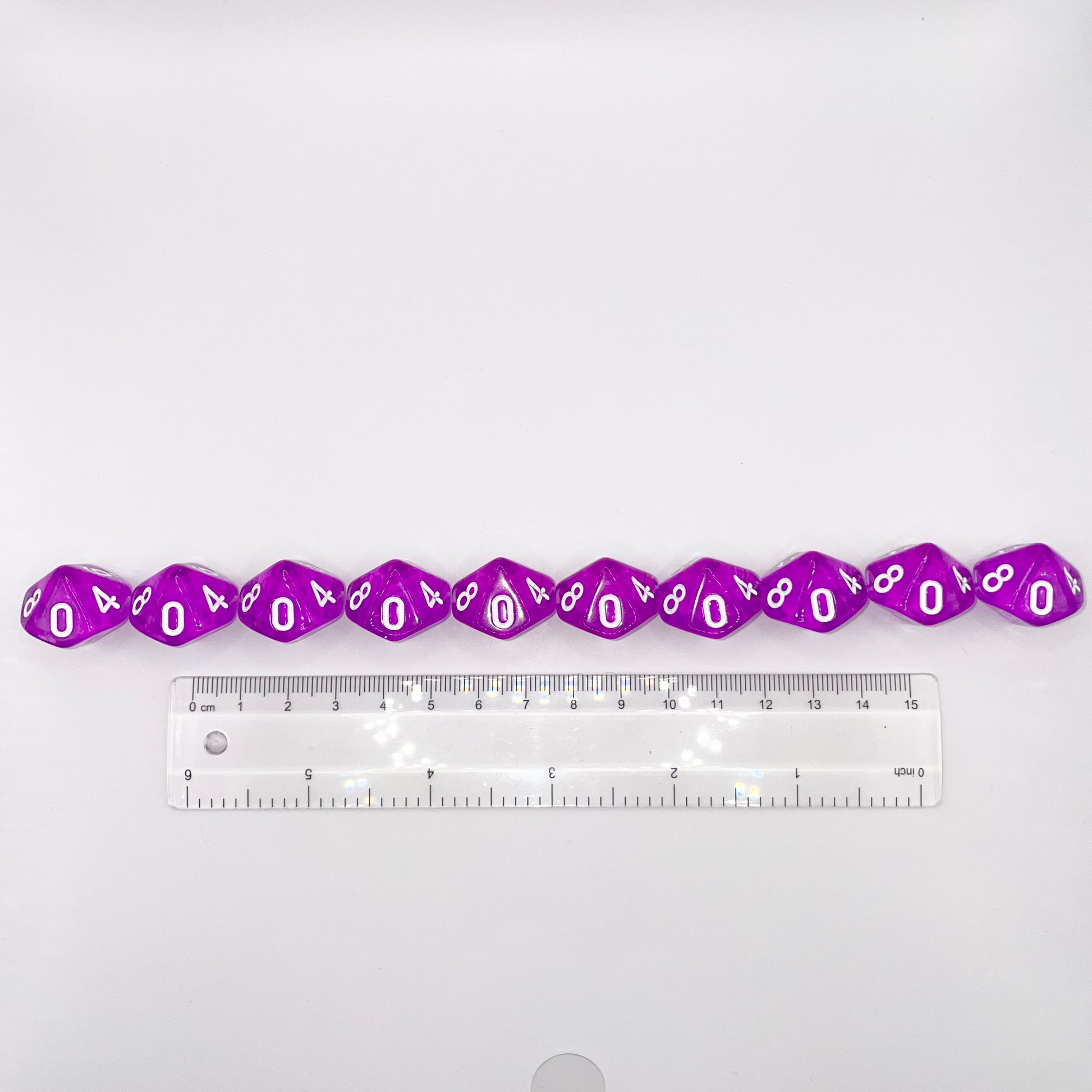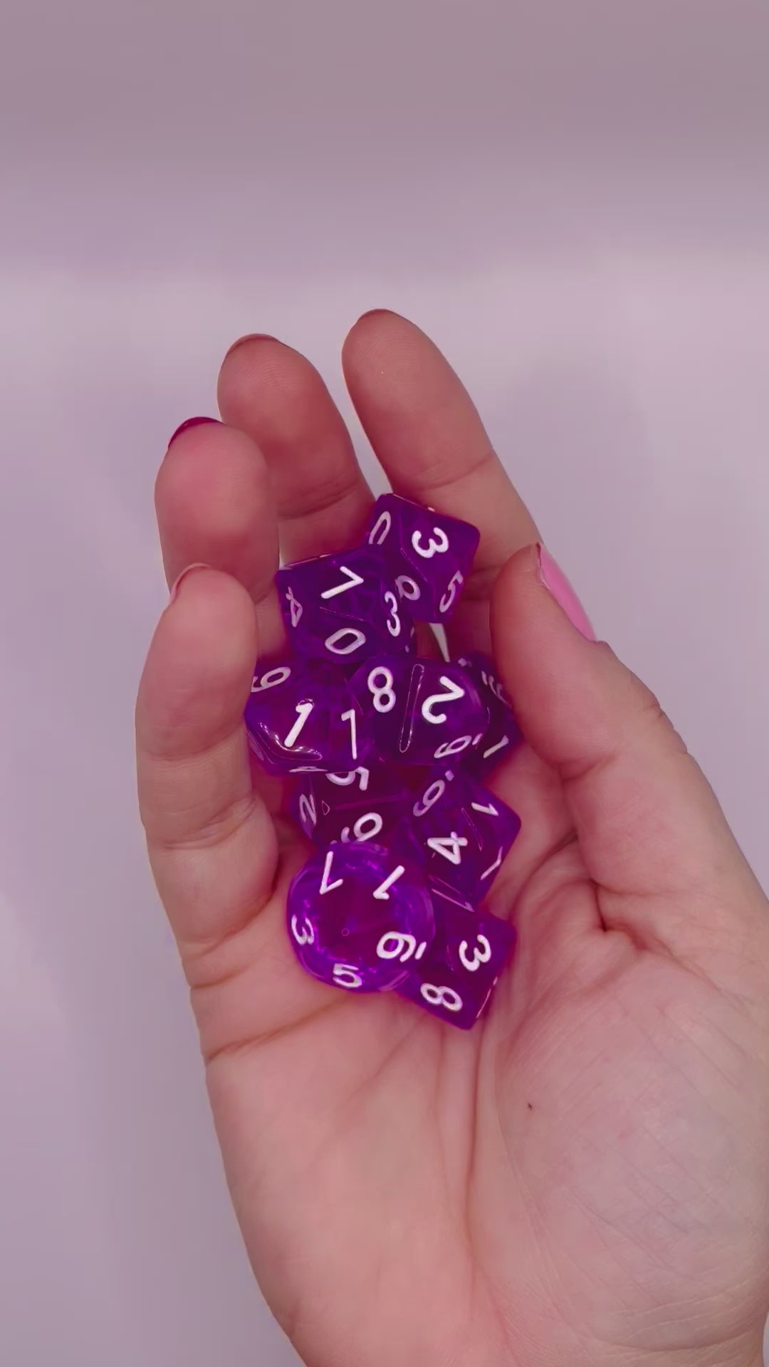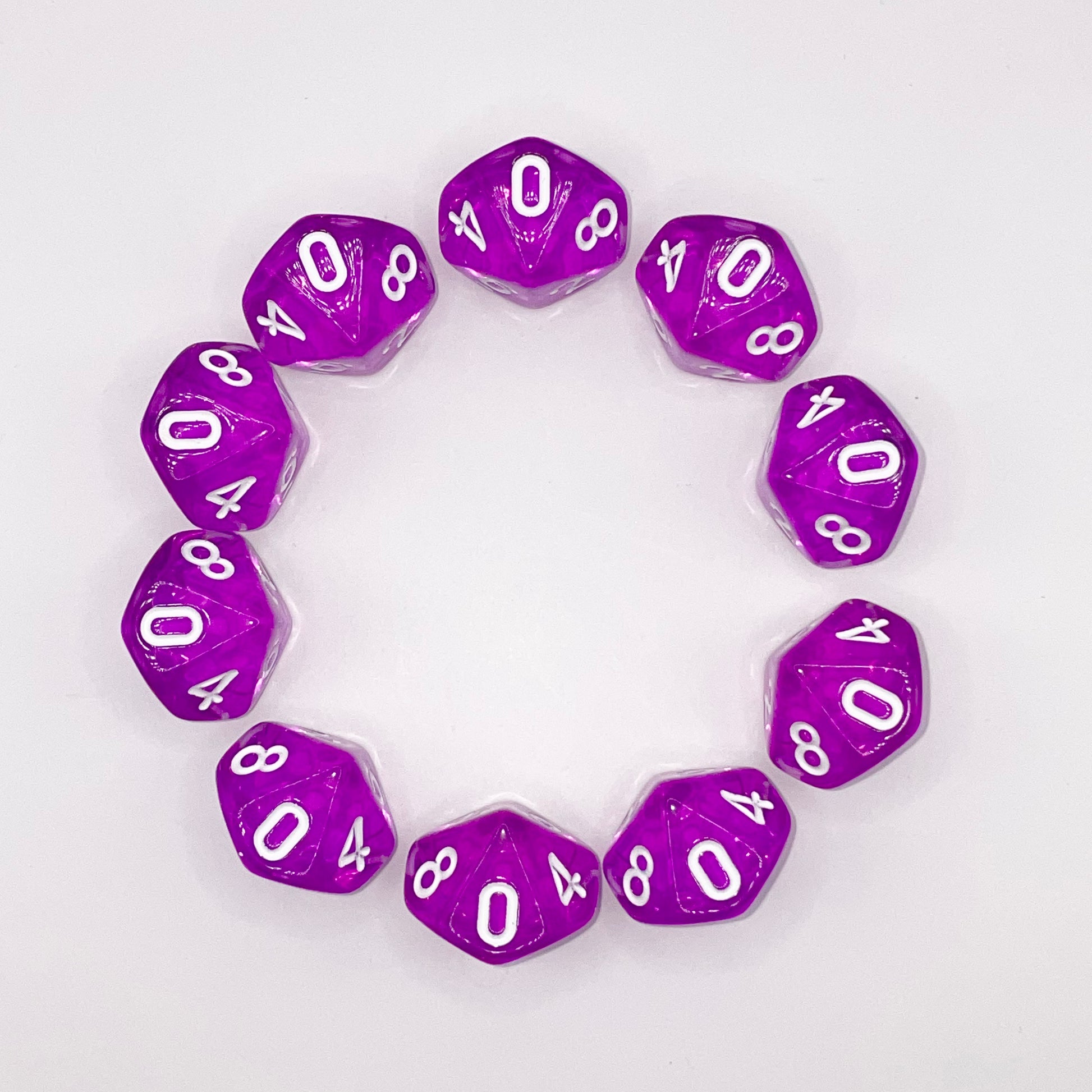 Crystal clear and perfectly purple, this d10 math rock set is perfect for a game of Vampire: The Masquerade or any World of Darkness or Chronicles of Darkness game.