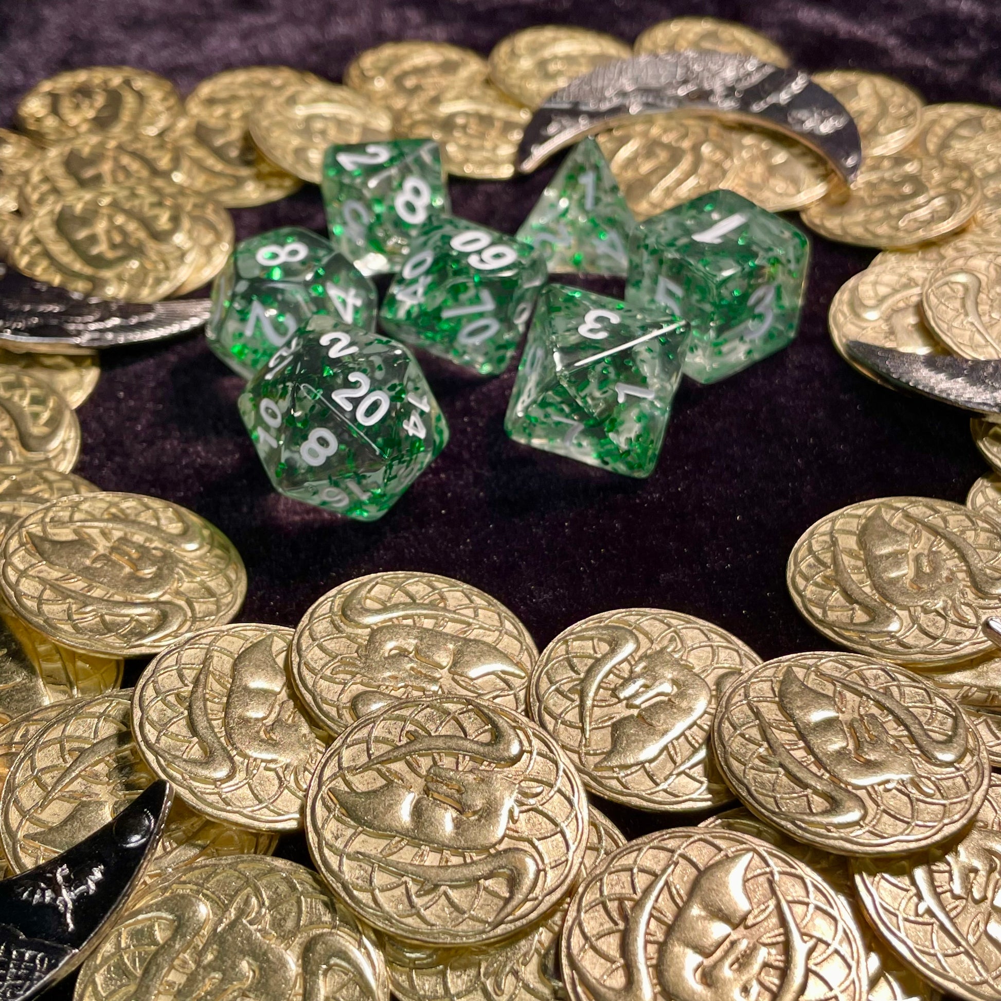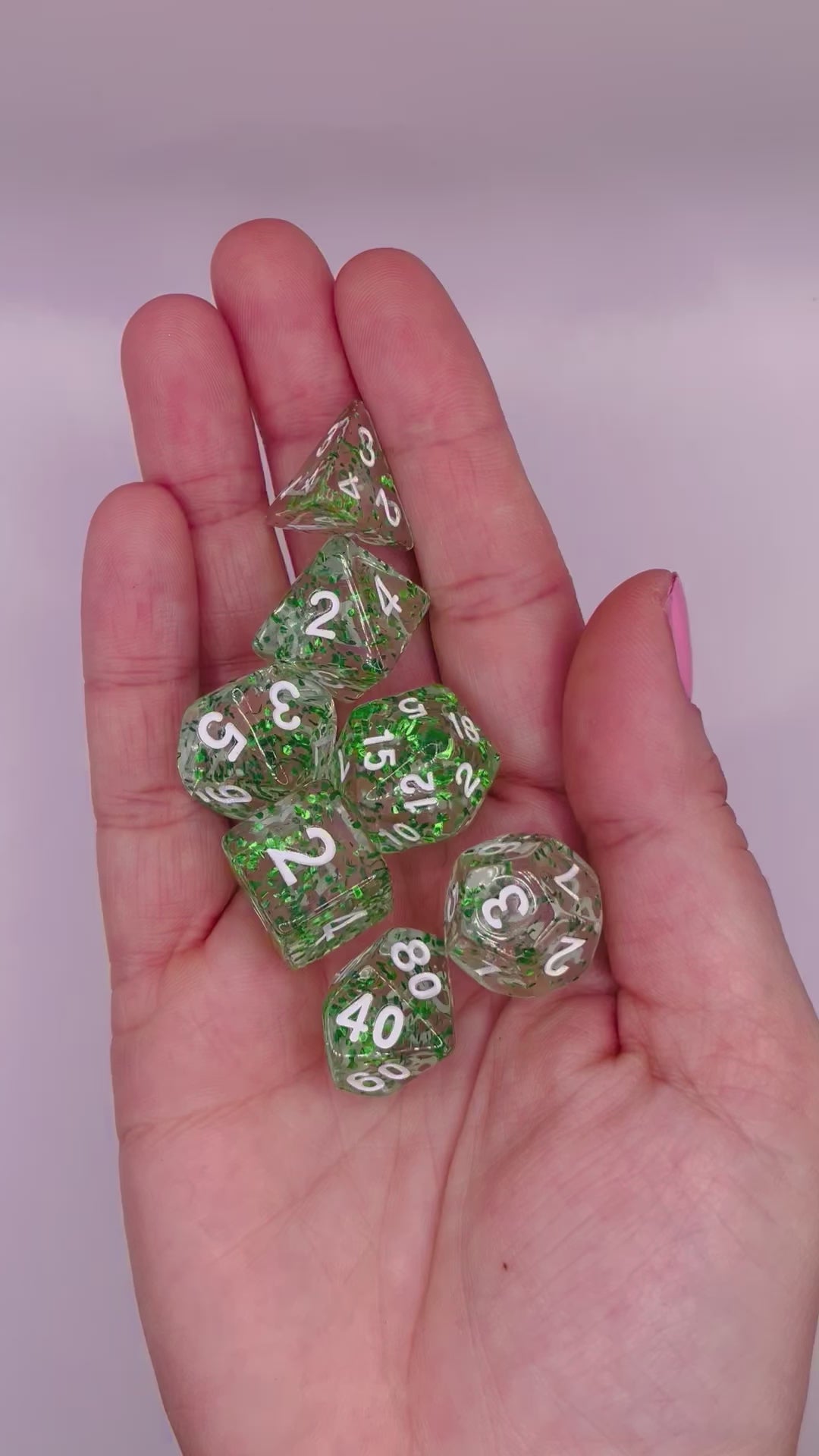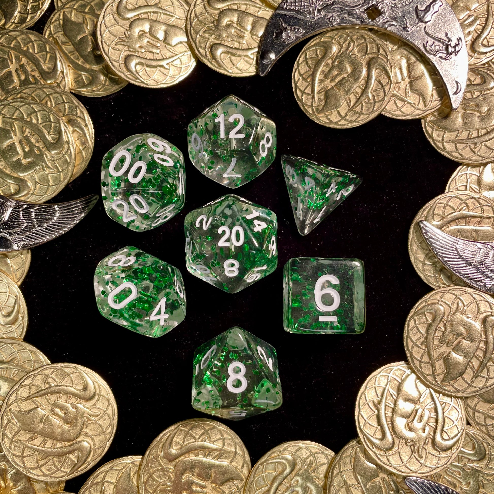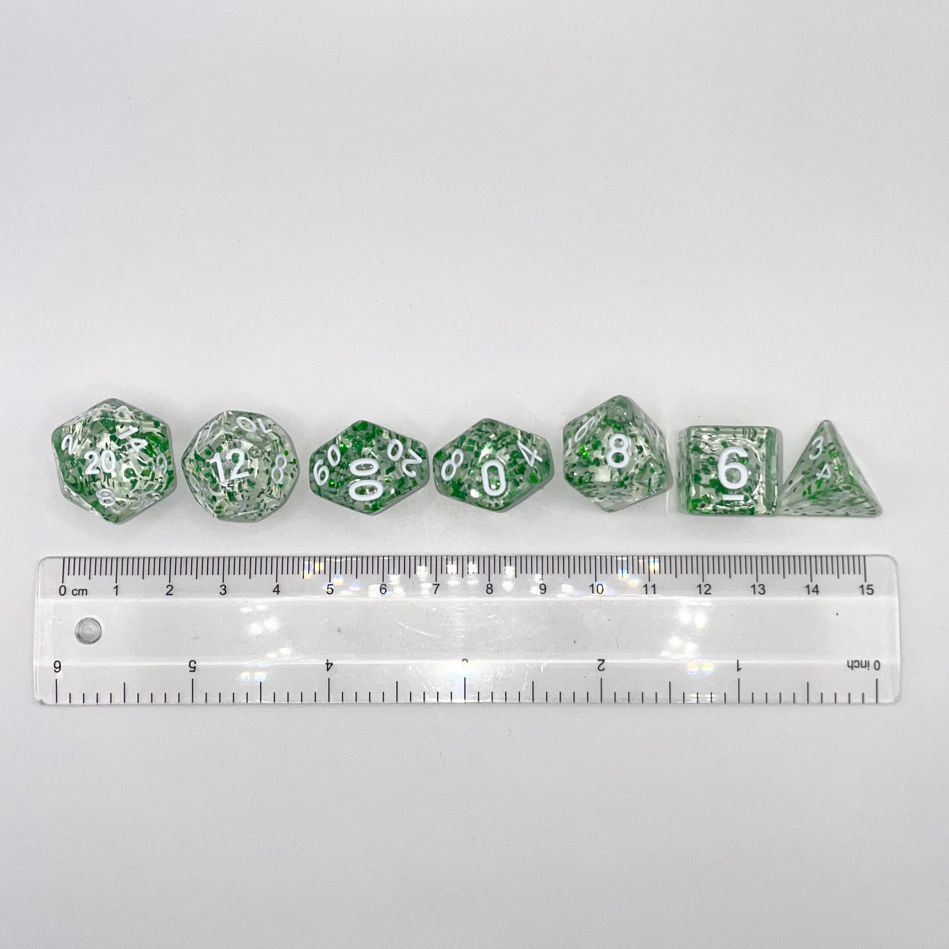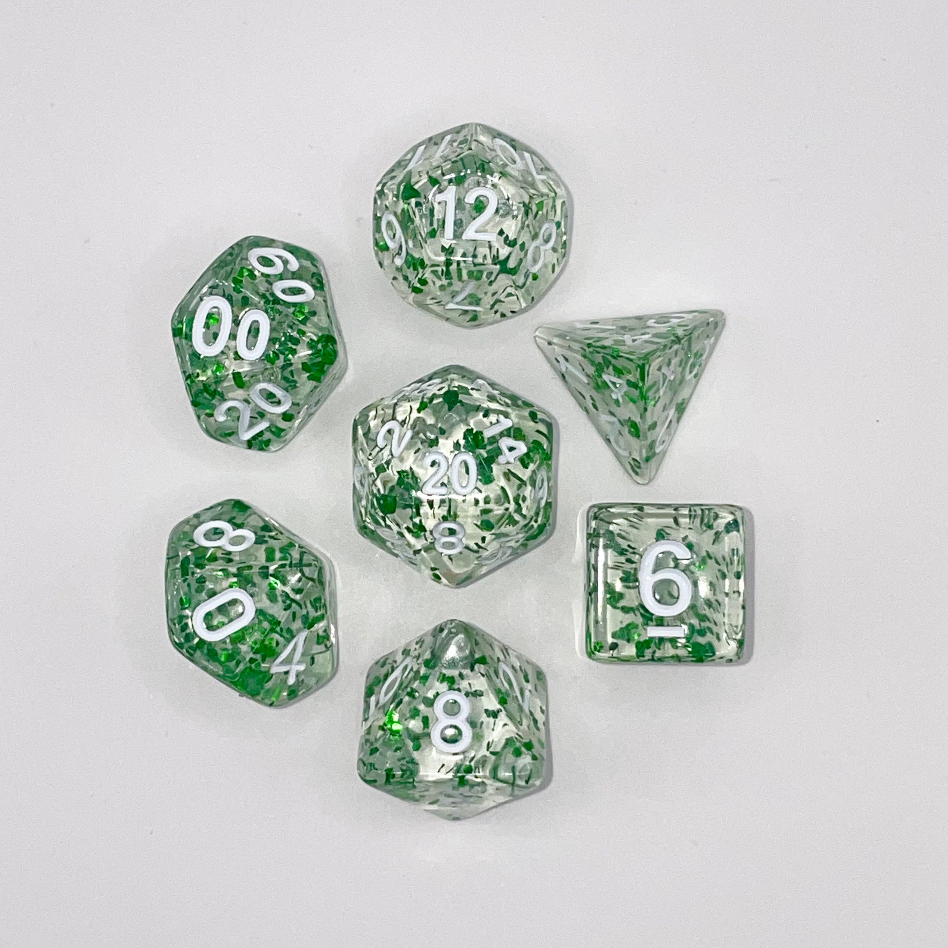 Be transported to the Feywild and roll up a magical fairy druid with our green, glitter, polyhedral dice set. Transparent and eye-catching, these shiny math rocks make an amazing addition to any dice dragon’s hoard!