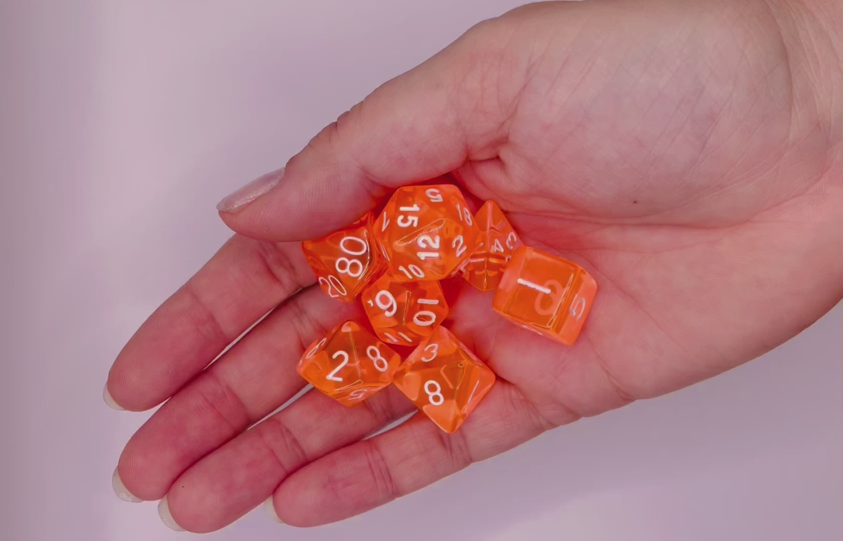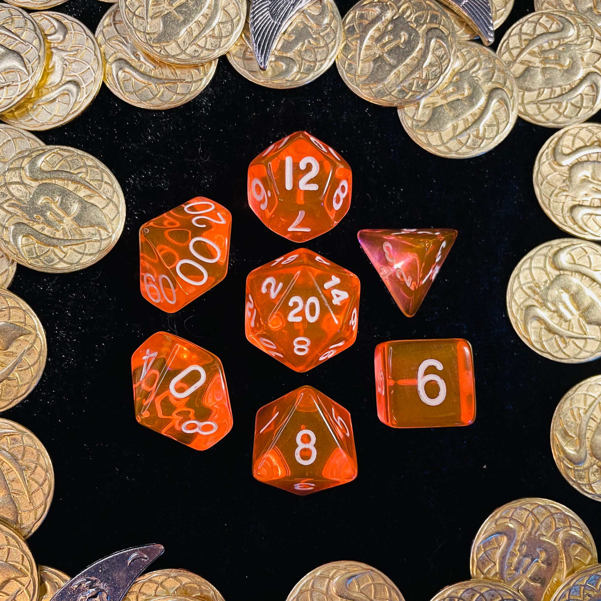 Energise your game with our dazzling, zesty orange dice set. Ultra bright and crystal clear, these dice will pep up your play in a flash!