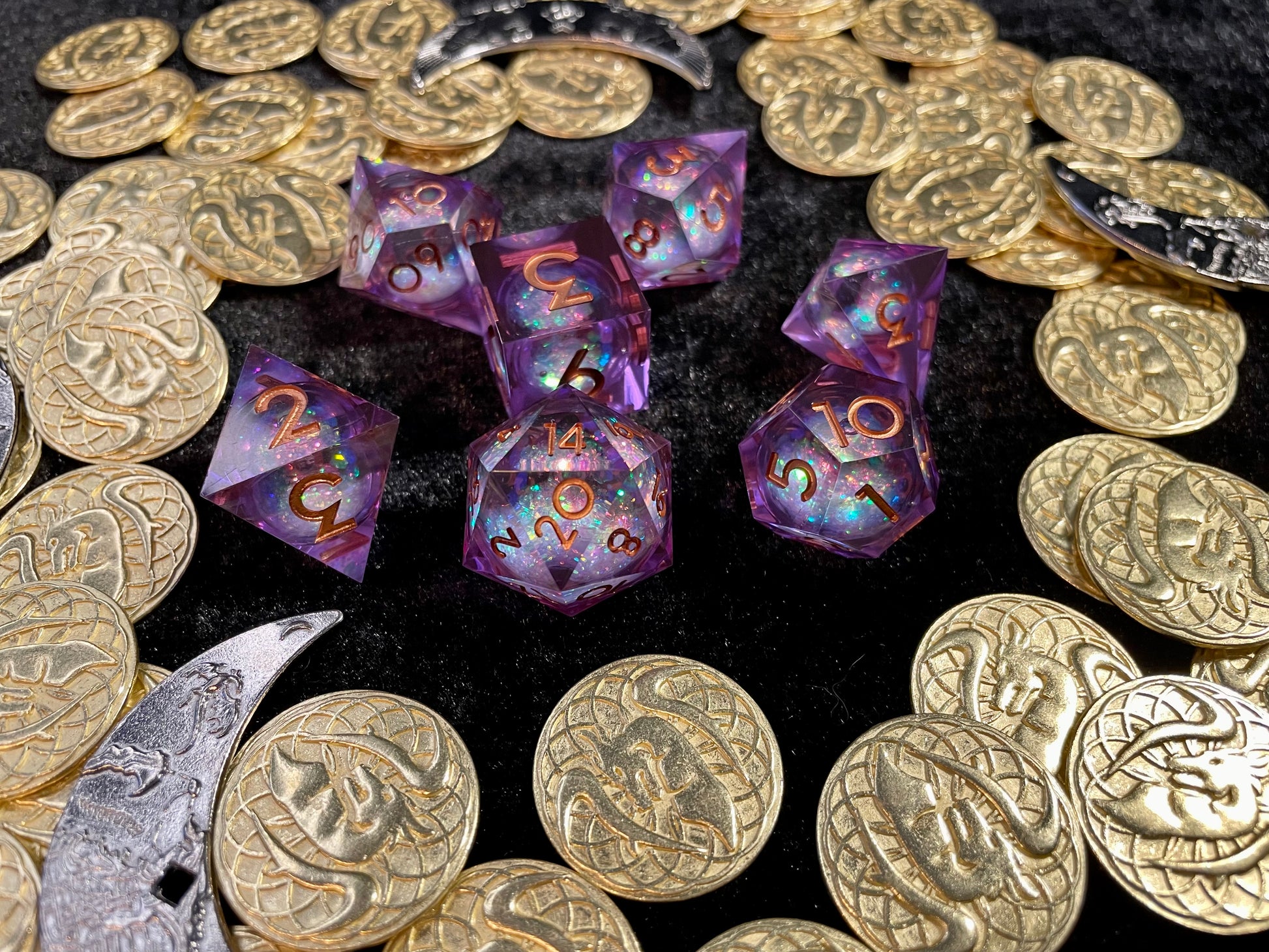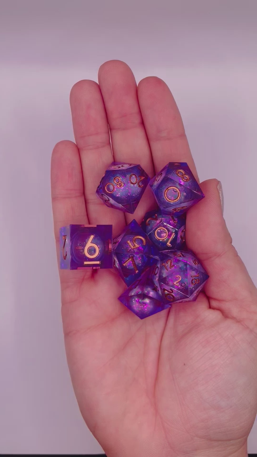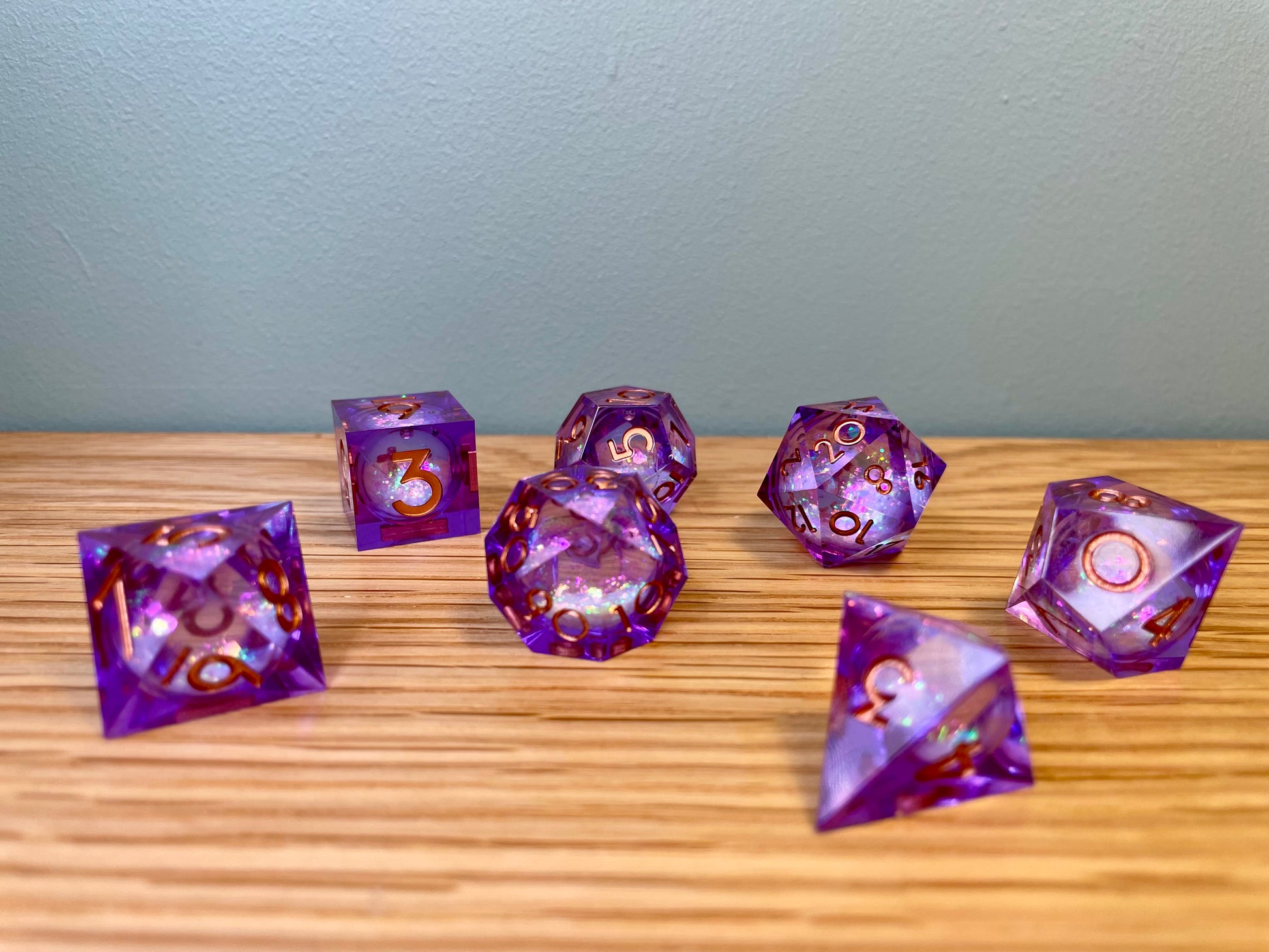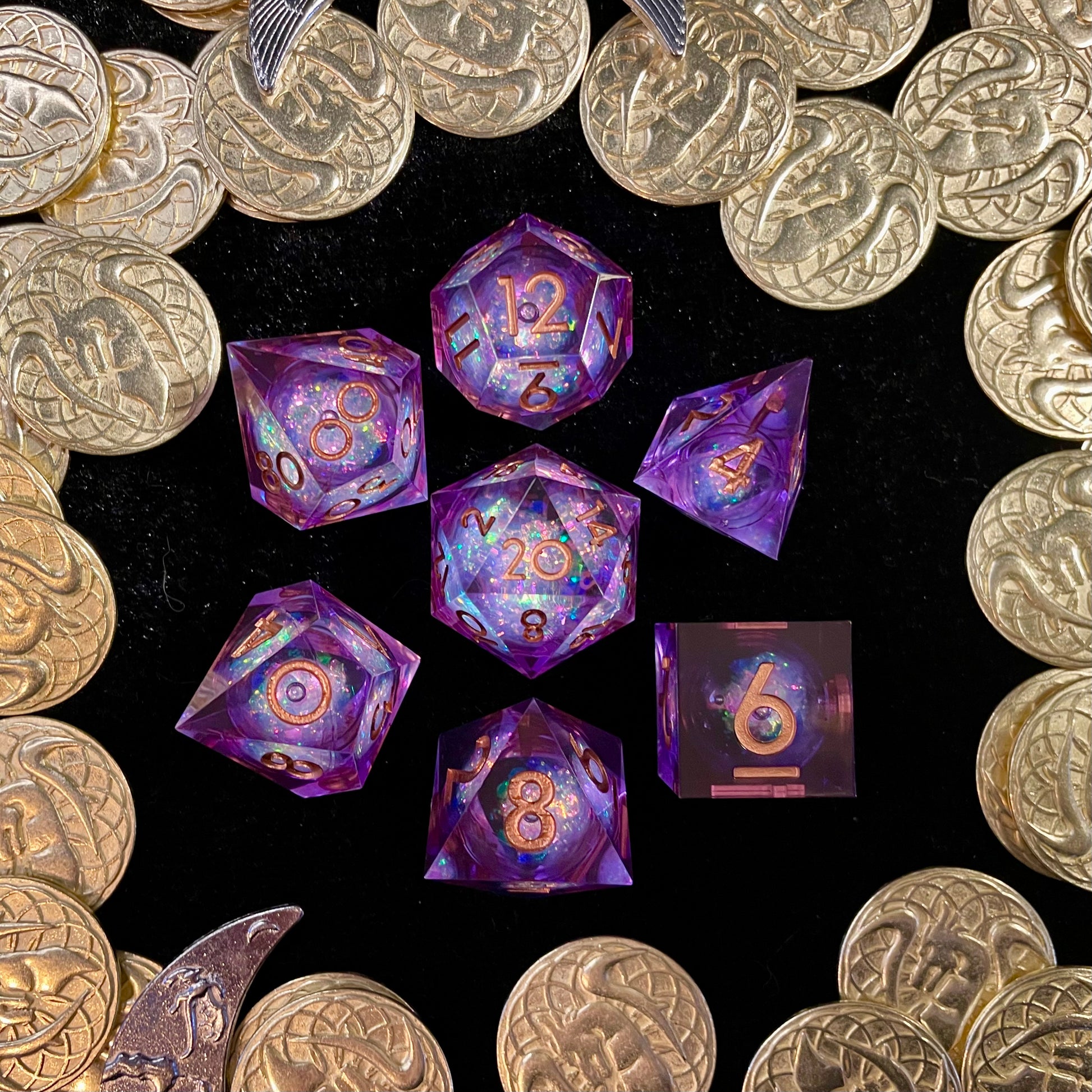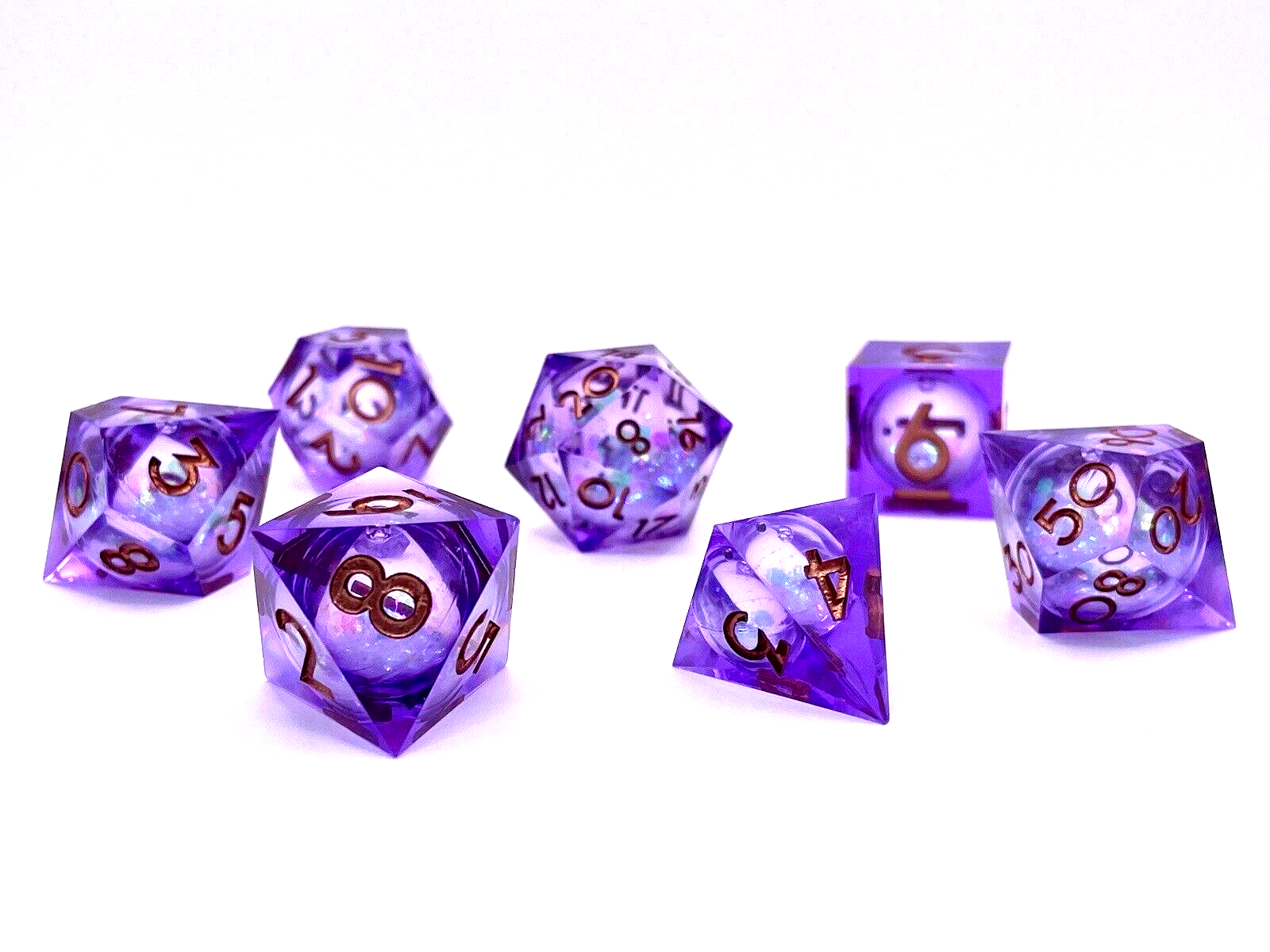 Roll like fae royalty with these purple glittery liquid core dice. Sharp edged and transparent these shiny math rocks are enough to impress even the most established dice goblins.